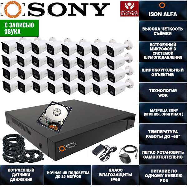 Готовая IP система видеонаблюдения с питанием POE. Комплект видеонаблюдения ISON ALFA S на 32 камеры производит запись в формате высокой четкости 4 мегапикселя 1440p, а также имеет удобную функцию передачи питания и видеосигнала по одному кабелю POE, данная функция значительно упростит монтаж и настройку системы. Система видеонаблюдения ISON ALFA S имеет функцию удаленного просмотра со смартфона. Система имеет встроенный POE коммутатор, поддержку 3g/4g, встроенные датчики движения, высококачественную матрицу SONY (ОРИГИНАЛ). IP система видеонаблюдения с POE ISON ALFA S на 32 камеры включает в себя IP камеры с POE питанием, кабель для видеонаблюдения витая пара с разъемами, видеорегистратор, POE коммутаторы. Готовую IP систему видеонаблюдения ISON ALFA S на 32 камеры с POE легко подключить и настроить самостоятельно. Если вы хотите заменить стандартные 18-метровые бухты кабеля на более длинные либо регистратор под расширение выберите нужную вам замену в конфигураторе возле кнопки купить. Опционально к данной системе видеонаблюдения вы можете добавить источник бесперебойного питания (для защиты вашей системы от перепадов напряжения и для работы системы при отключении электроэнергии) и основания для крепления камер (для герметизации разъёмов при уличном монтаже). Оформить заказ на данный комплект видеонаблюдения вы можете добавив его в корзину. Доставка при заказе от 15 000р бесплатная в любой город РФ.