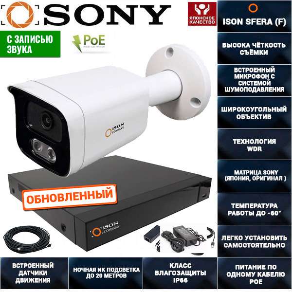 Готовая IP система видеонаблюдения с питанием POE. Комплект видеонаблюдения ISON SFERA на 1 камеру производит запись в формате высокой четкости 3 мегапикселя Full HD, а также имеет удобную функцию передачи питания и видеосигнала по одному кабелю POE, данная функция значительно упростит монтаж и настройку системы. Система видеонаблюдения ISON SFERA на 1 камеру имеет функцию удаленного просмотра со смартфона. Система имеет встроенный POE коммутатор, поддержку 3g/4g, встроенные датчики движения, высококачественную матрицу Sony. IP система видеонаблюдения с POE ISON SFERA на 1 камеру включает в себя IP камеры с POE питанием, кабель для видеонаблюдения витая пара с разъемами, видеорегистратор со встроенными POE портами. Готовую IP систему видеонаблюдения ISON SFERA с POE легко подключить и настроить самостоятельно. Если вы хотите заменить стандартные 18-метровые бухты кабеля на более длинные либо либо регистратор под расширение выберите нужную вам замену в конфигураторе возле кнопки купить. Опционально к данной системе видеонаблюдения вы можете добавить жёсткий диск (для записи видео), источник бесперебойного питания (для защиты вашей системы от перепадов напряжения и для работы системы при отключении электроэнергии) и основания для крепления камер (для герметизации разъёмов при уличном монтаже). Оформить заказ на данный комплект видеонаблюдения вы можете добавив его в корзину. Доставка при заказе от 15 000р бесплатная в любой город РФ.