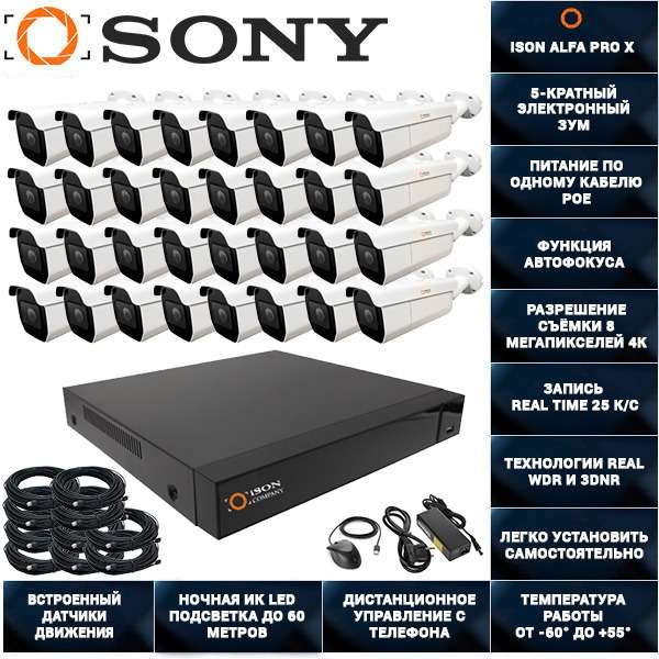 Готовая IP система видеонаблюдения на 32 камеры POE 8mpx ISON ALFA PRO X-32 является одним из самых мощных из существующих профессиональных систем видеонаблюдения. Система имеет высокое разрешение 8 мегапикселей с вариофокальными моторизованными объективами 2,7-13,5мм (возможность управление зумом со смартфона, планшета или компьютера находясь в любой точке земного шара). IP система видеонаблюдения на 32 камеры POE 8mpx ISON ALFA PRO X-32 есть в комплектациях на 1,2,4,6,8,16,32 и 64 камеры. Вы можете заказать IP систему видеонаблюдения на 32 камеры в нашем интернет магазине как с жестким диском или без. Комплект видеонаблюдения 32 камеры включает в себя все необходимое: кабель, разъемы, вариофокальные моторизованные камеры с датчиками движения, ночной подсветкой высоким разрешением 8 мегапикселей, регистратор, блок питания для видеорегистратора, разветвитель питания и крепеж. Если вы хотите заменить стандартные 18-метровые бухты кабеля на более длинные либо либо регистратор под расширение выберите нужную вам замену в конфигураторе возле кнопки купить. Опционально к данной системе видеонаблюдения вы можете добавить 1 или несколько микрофонов для записи звука (микрофоны подключаются напрямую к камере), жёсткий диск (для записи видео), источник бесперебойного питания (для защиты вашей системы от перепадов напряжения и для работы системы при отключении электроэнергии) и основания для крепления камер (для герметизации разъёмов при уличном монтаже). Оформить заказ на данный комплект видеонаблюдения вы можете добавив его в корзину. Доставка при заказе от 15 000р бесплатная в любой город РФ.