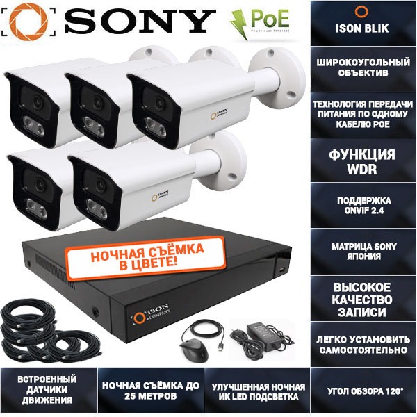 Готовая IP система видеонаблюдения с питанием POE. Комплект видеонаблюдения ISON BLIK на 5 камер производит запись в формате высокой четкости 5 мегапикселей 1440p, а также имеет удобную функцию передачи питания и видеосигнала по одному кабелю POE, данная функция значительно упростит монтаж и настройку системы. Система видеонаблюдения ISON BLIK на 5 камер имеет функцию удаленного просмотра со смартфона. Система имеет встроенный POE коммутатор, поддержку 3g/4g, встроенные датчики движения, высококачественную матрицу SONY. IP система видеонаблюдения с POE ISON BLIK включает в себя IP камеры с POE питанием, кабель для видеонаблюдения витая пара с разъемами, видеорегистратор со встроенными POE портами. Готовую IP систему видеонаблюдения ISON BLIK на 5 камер с POE легко подключить и настроить самостоятельно. Если вы хотите заменить стандартные 18-метровые бухты кабеля на более длинные либо либо регистратор под расширение выберите нужную вам замену в конфигураторе возле кнопки купить. Опционально к данной системе видеонаблюдения вы можете добавить жёсткий диск (для записи видео), источник бесперебойного питания (для защиты вашей системы от перепадов напряжения и для работы системы при отключении электроэнергии) и основания для крепления камер (для герметизации разъёмов при уличном монтаже). Оформить заказ на данный комплект видеонаблюдения вы можете добавив его в корзину. Доставка при заказе от 15 000р бесплатная в любой город РФ.
