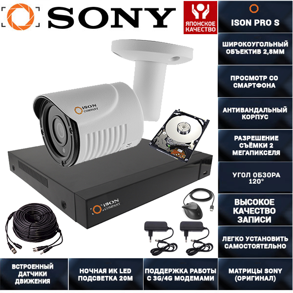 Готовая система видеонаблюдения для дома и Дачи ISON PRO S на 1 камеру на 1 камеру является одним из самых популярных комплектов видеонаблюдения для самостоятельной установки в России и СНГ. Система ISON PRO S есть в комплектациях на 1, 2, 4, 6, 8, 16 и 23 камеры. Вы можете заказать систему видеонаблюдения ISON для дома и Дачи в нашем интернет магазине как с жестким диском или без. Комплект видеонаблюдения ISON Глаз на 1 камеру включает в себя все необходимое: кабель, разъемы, широкоугольные камеры с датчиками движения, ночной подсветкой высоким разрешением 2 мегапикселя, регистратор, блок питания для видеорегистратора, блок питания для камер видеонаблюдения, разветвитель питания и крепеж. Готовая система для дома и дачи ISON Глаз на 1 камеру имеет высокое качество и надежность. Если вы хотите заменить стандартные 18-метровые бухты кабеля на более длинные либо регистратор под расширение выберите нужную вам замену в конфигураторе возле кнопки купить. Опционально к данной системе видеонаблюдения вы можете добавить 1 или несколько микрофонов для записи звука, источник бесперебойного питания (для защиты вашей системы от перепадов напряжения и для работы системы при отключении электроэнергии) и основания для крепления камер (для герметизации разъёмов при уличном монтаже). Оформить заказ на данный комплект видеонаблюдения вы можете добавив его в корзину. Доставка при заказе от 15 000р бесплатная в любой город РФ.